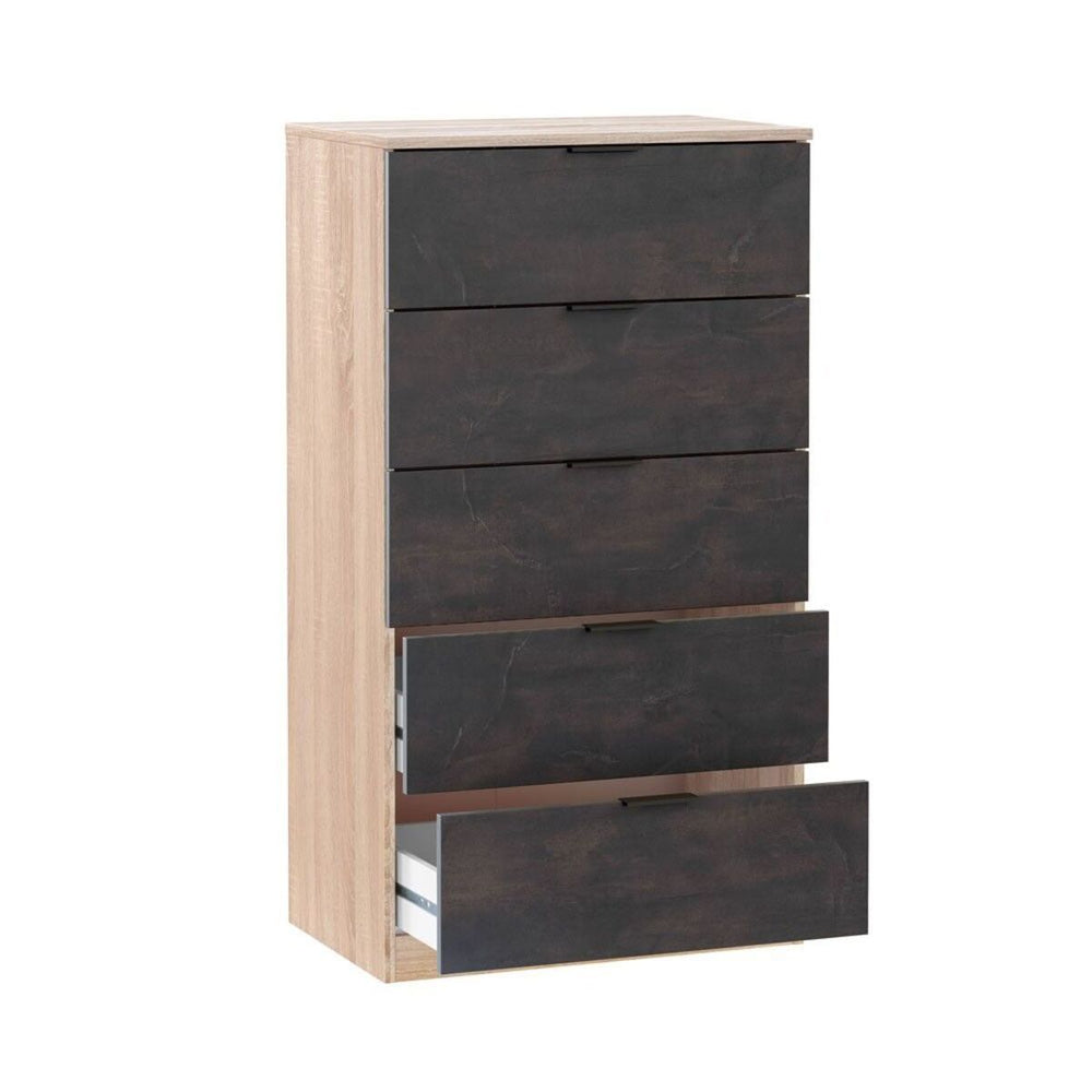 El Sinfonier con 5 Cajones 110x60 cm te proporcionara un espacio lleno de modernidad y bienestar. Su diseño y color roble y wengue daran un toque muy moderno al dormitorio, recibidor o cualquier estancia. El Sinfonier con 5 Cajones 110x60 cm es de color roble y wengue, lo que hace que el mueble sea completamente moderno y de un toque de diseño a tu espacio.