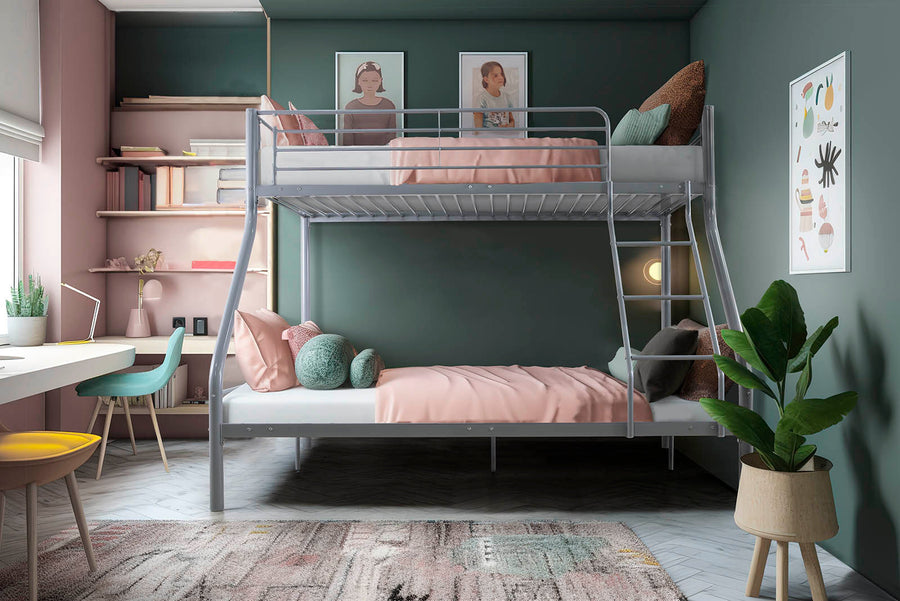 Litera doble con una estructura metalica con cama de matrimonio abajo e individual arriba. Esta litera es perfecta para espacios reducidos y se adecua perfectamente a cualquier estilo de decoracion. Marco de metal resistente, seguro y duradero que proporciona comodidad y apoyo necesarios.